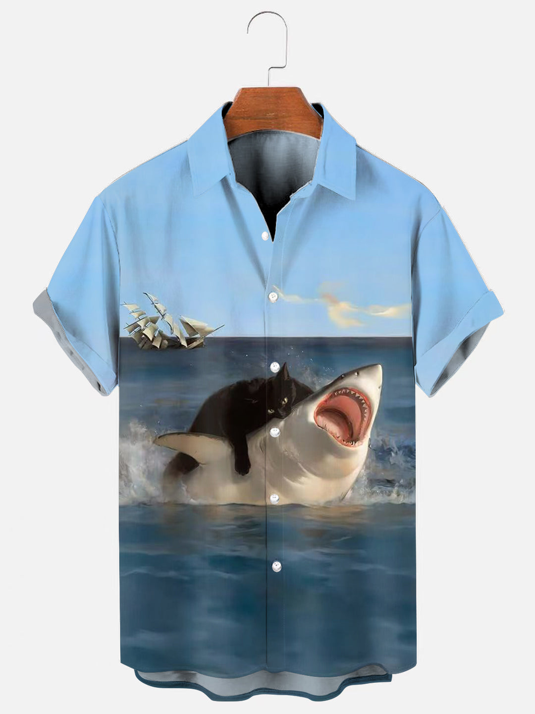 Fat Cat Vs. Shark Funny Print Hawaiian Short Sleeve Shirt