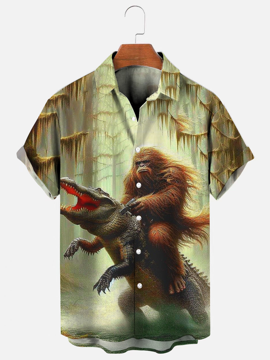 Men's Alligator Bigfoot Print Hawaiian Short Sleeve Shirt