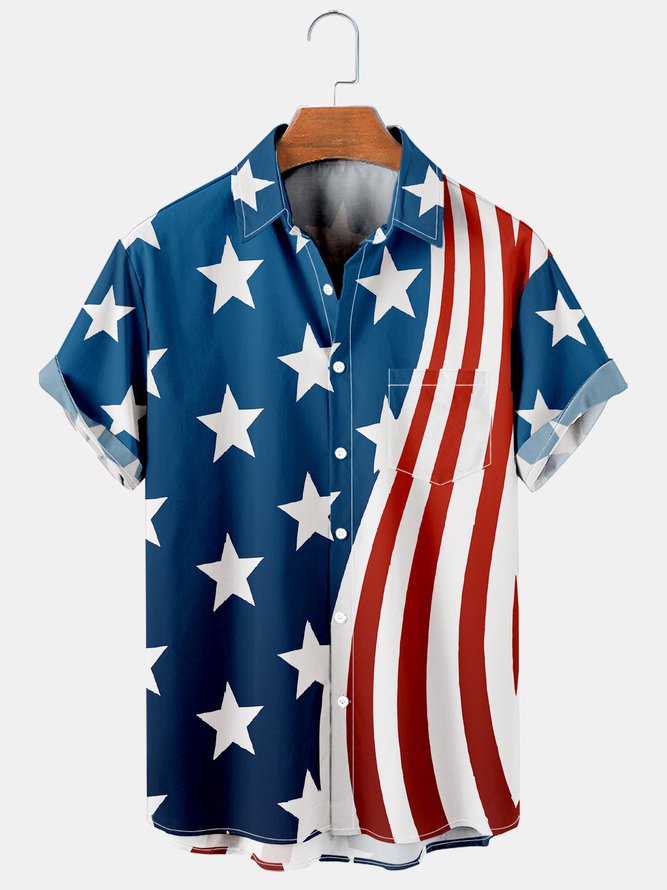 Mens American Flag Casual Breathable Chest Pocket Short Sleeve Hawaiian Shirts