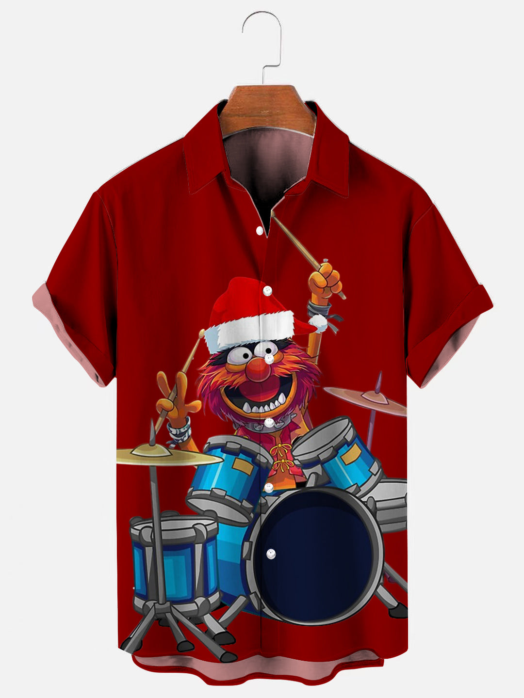 Men's Cartoon Animal Drummer Christmas Print Hawaiian Short Sleeve Shirt