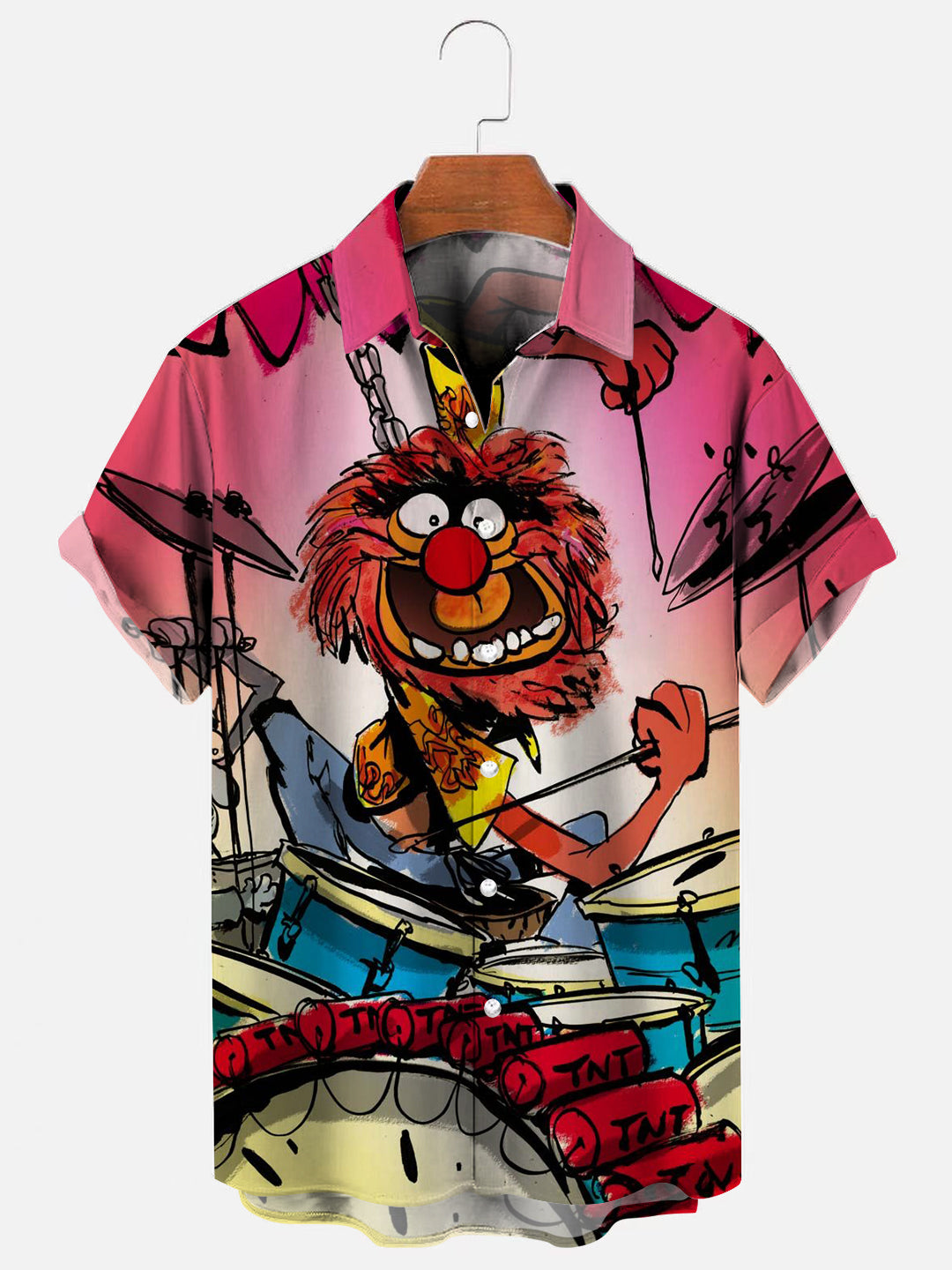 Men's Cartoon Animal Drummer Print Hawaiian Short Sleeve Shirt