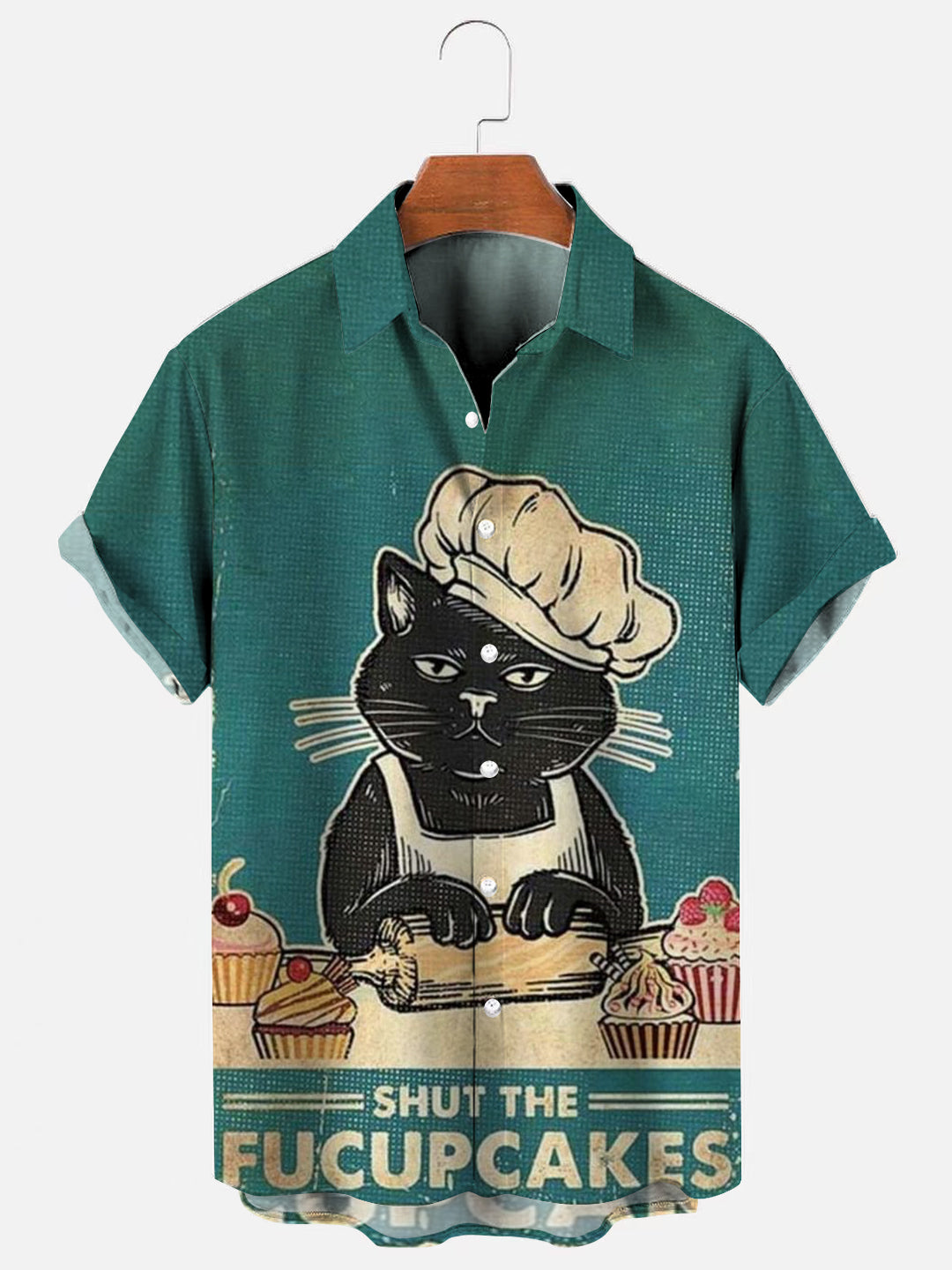 Men's Cat Baking Fun Printed Casual Short Sleeve Shirt