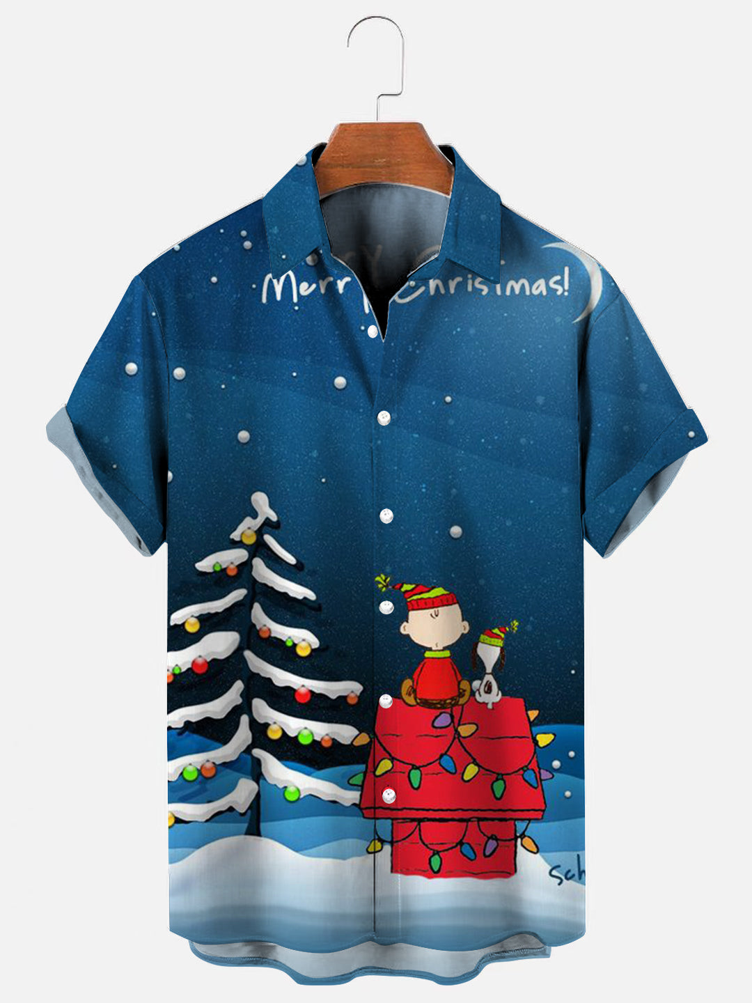 Men's Christmas Cartoon Character Decoration Tree Print Holiday Short Sleeve Shirt