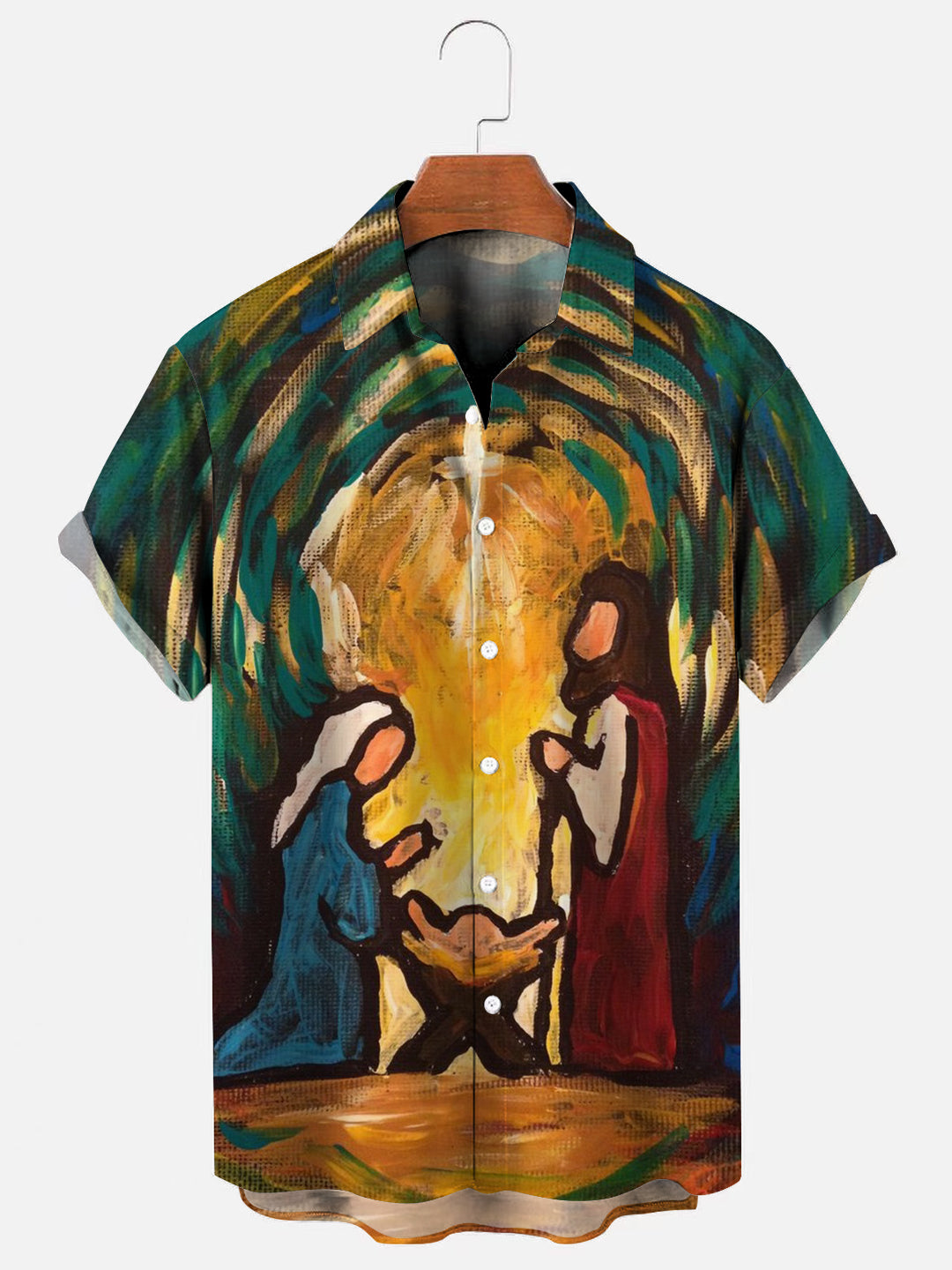 Men's Christmas Nativity Oil Painting Print Casual Short Sleeve Shirt