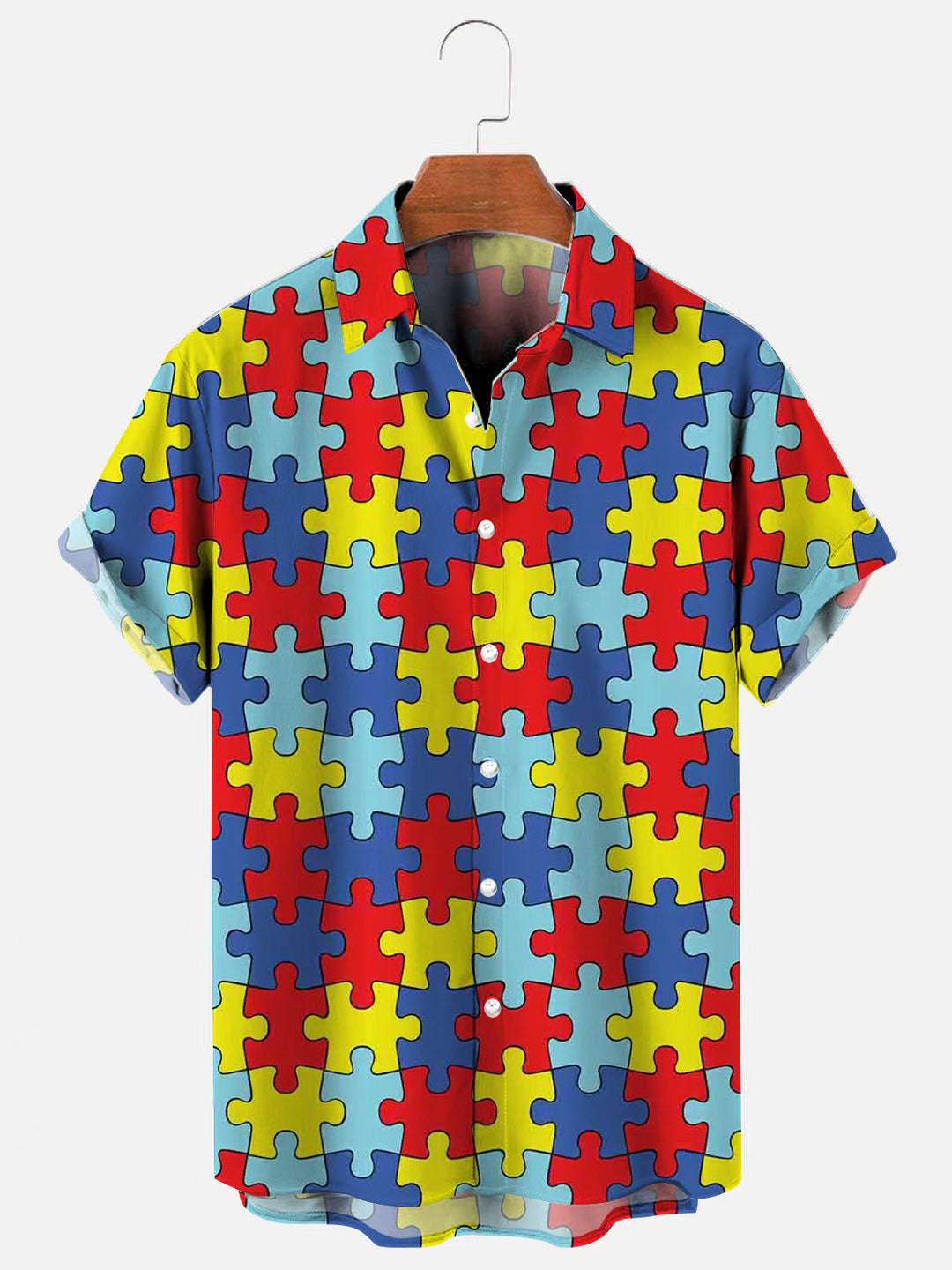 Men's Color Puzzle Print Hawaiian Short Sleeve Shirt