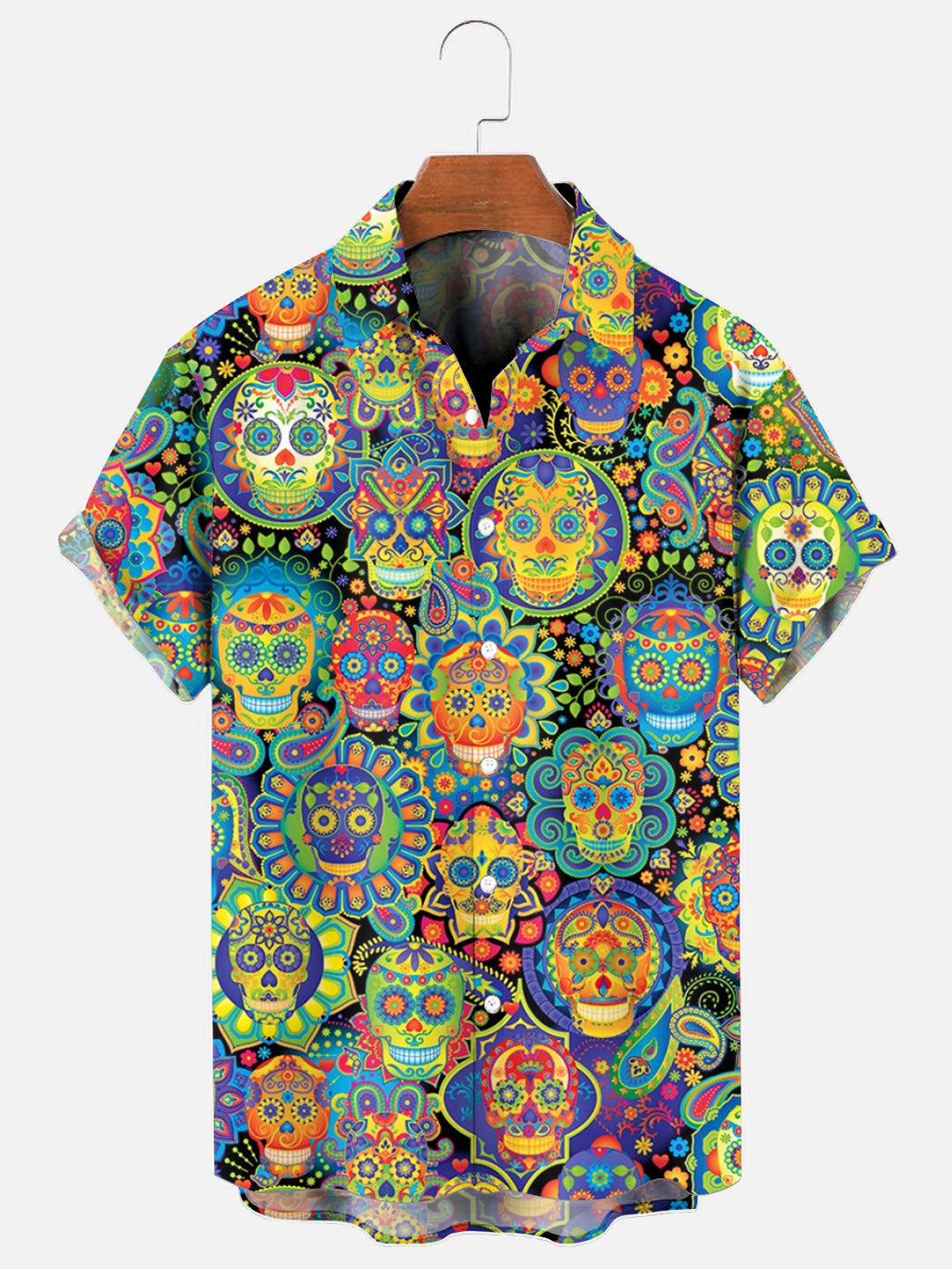 Men's Colorful Sugar Skull Print Hawaiian Short Sleeve Shirt