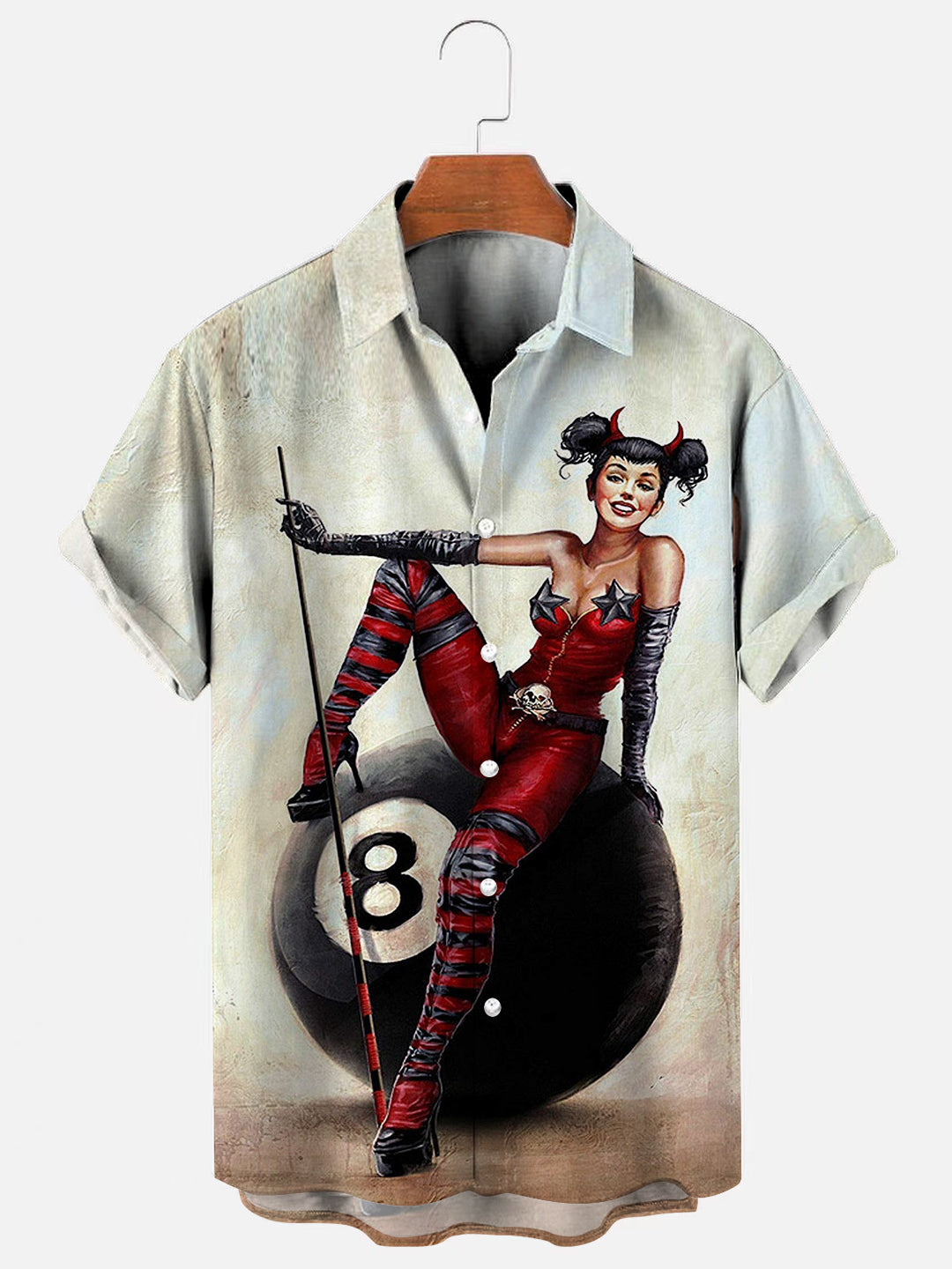 Men's Devil Girl Classic Black Eight Billiards Retro Print Casual Short Sleeve Shirt