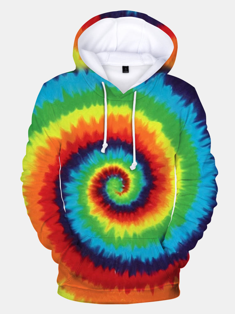 Men's Fashionable Rainbow Spiral Tie Dye Print Long Sleeve Hoodie