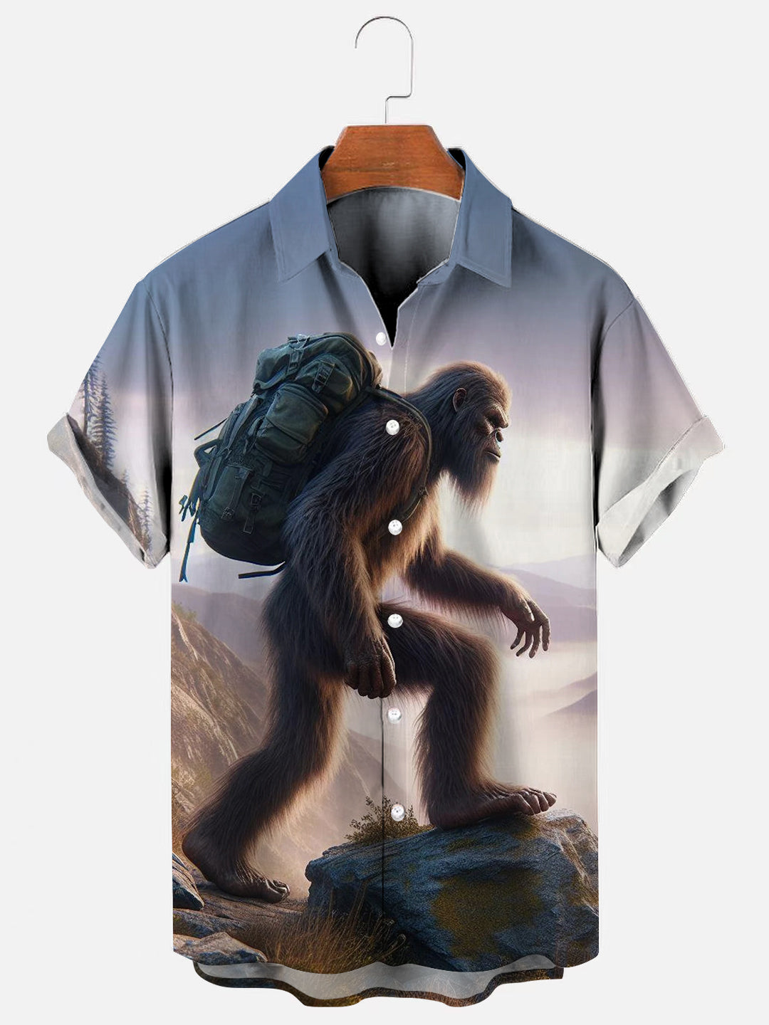 Men's Hiking Bigfoot Print Hawaiian Short Sleeve Shirt