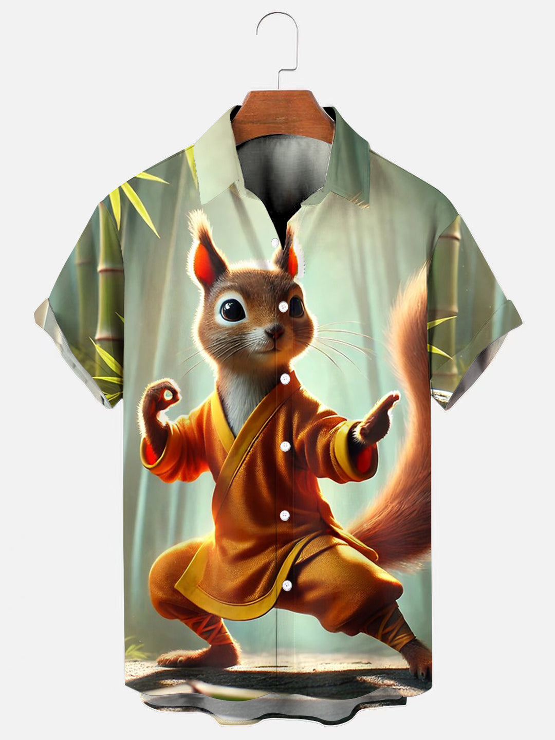 Men's Kung Fu Squirrel Printed Casual Short Sleeve Shirt