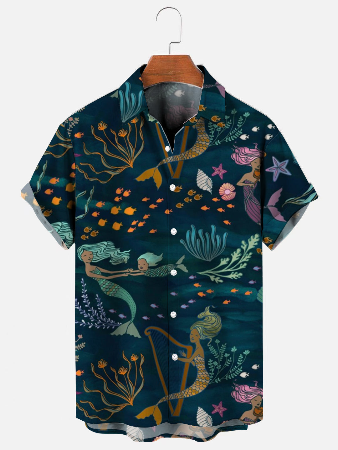 Men's Mermaid Music Ocean Graphic Print Hawaiian Casual Short Sleeve Shirt