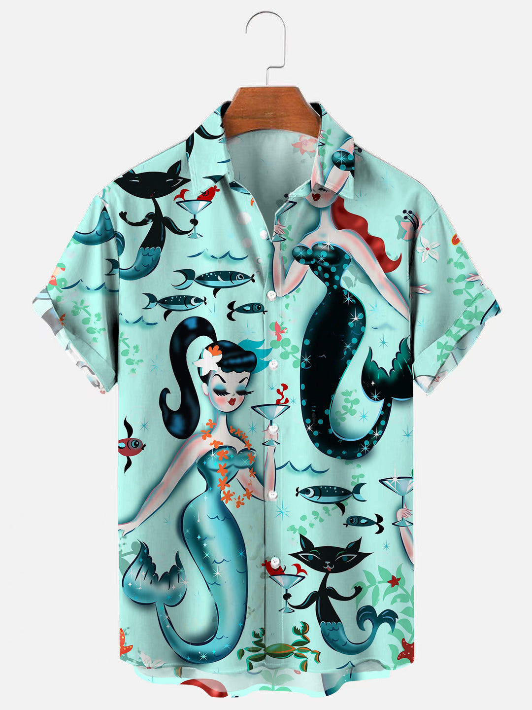 Men's Mid-Century Modern Martini Mermaid Print Hawaiian Short Sleeve Shirt