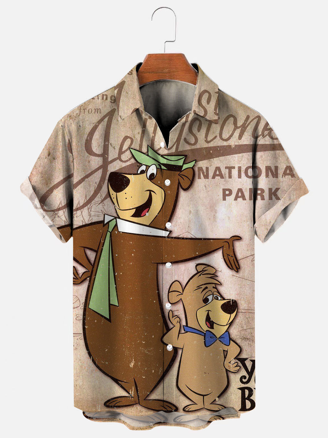Men's National Parks Yogi Bear Farm Retro Print Hawaiian Short Sleeve Shirt