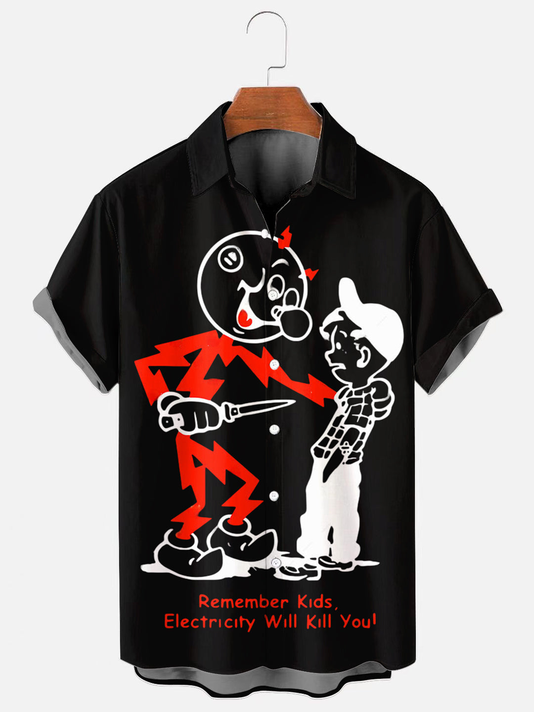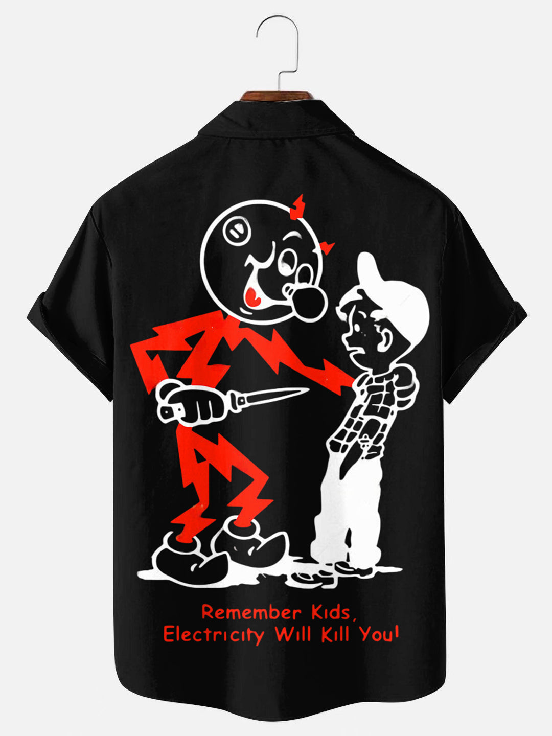 Men's Vintage 70s Electricity Warning Sign Print Hawaiian Short Sleeve Shirt