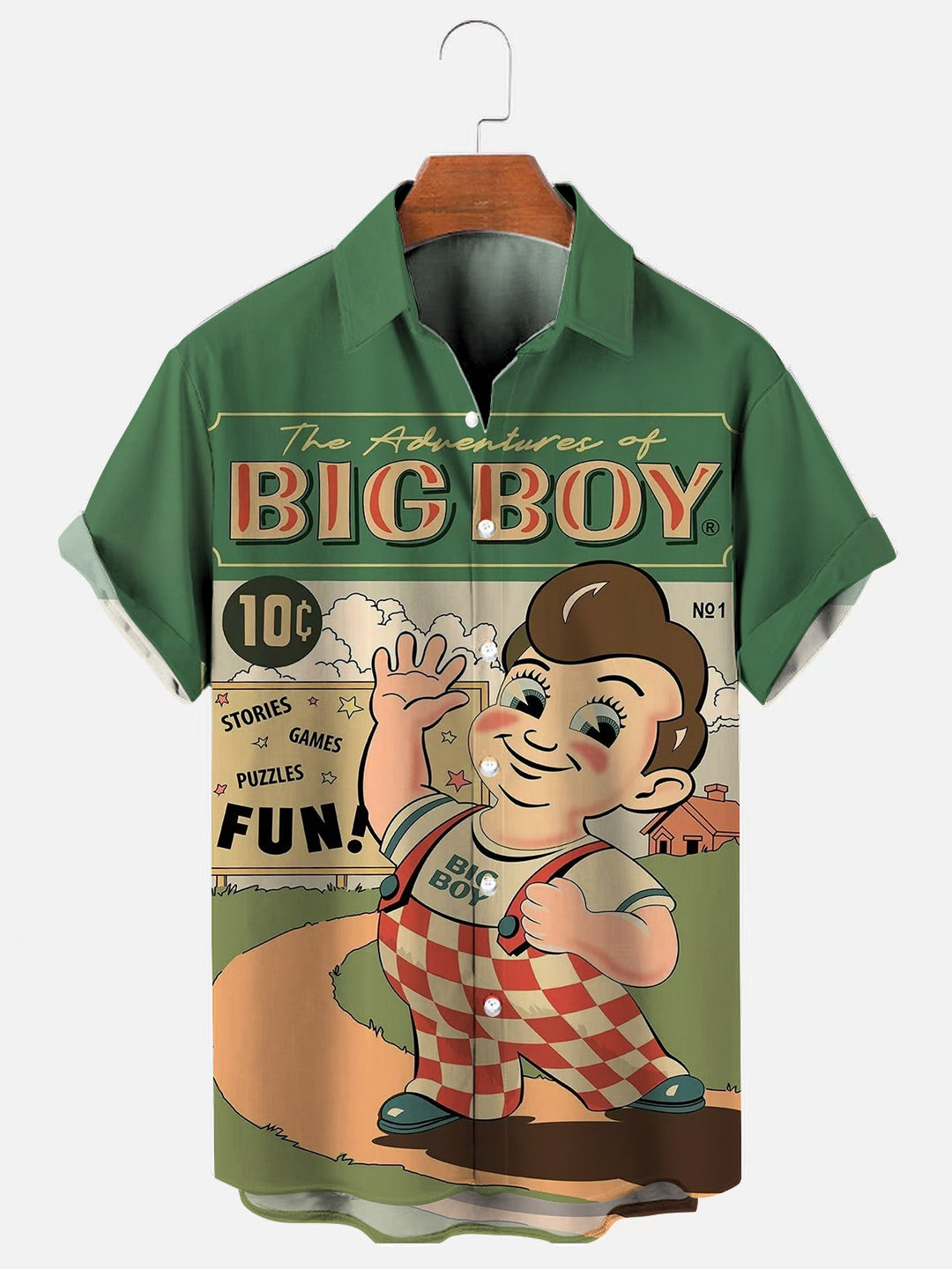 Men's Retro Cartoon Boy Print Hawaiian Short Sleeve Shirt
