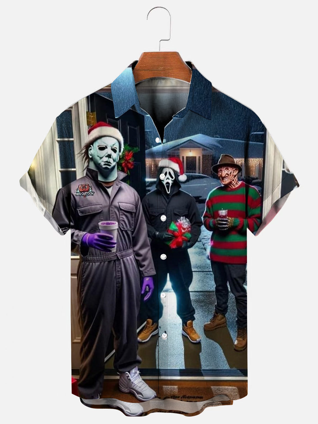 Men's Retro Horror Christmas Print Hawaiian Short Sleeve Shirt