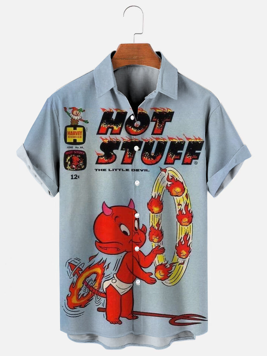 Men's Retro Little Devil Cartoon Print Hawaiian Short Sleeve Shirt