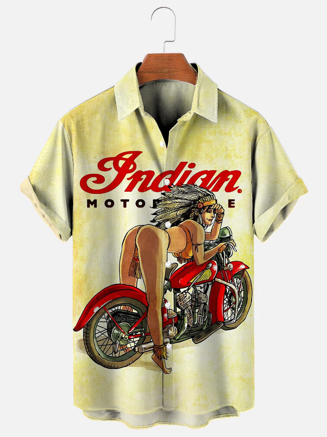 Men's Retro Motorcycle Girl Poster Print Hawaiian Short Sleeve Shirt