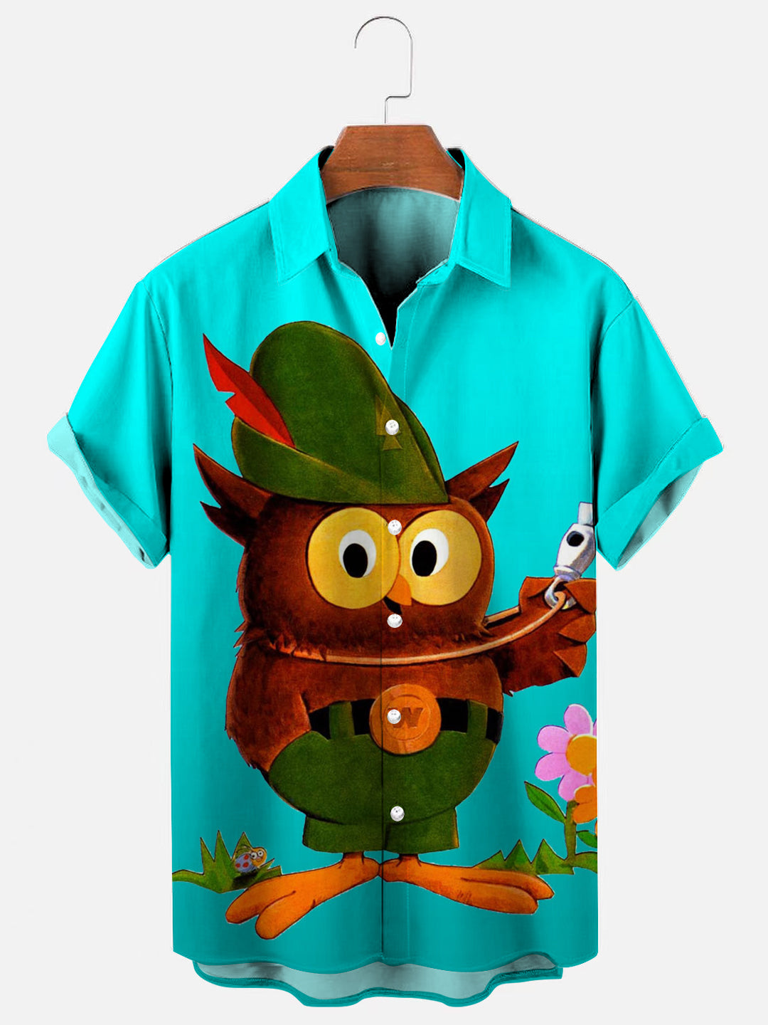 Men's Retro Owl Cartoon Print Hawaiian Short Sleeve Shirt