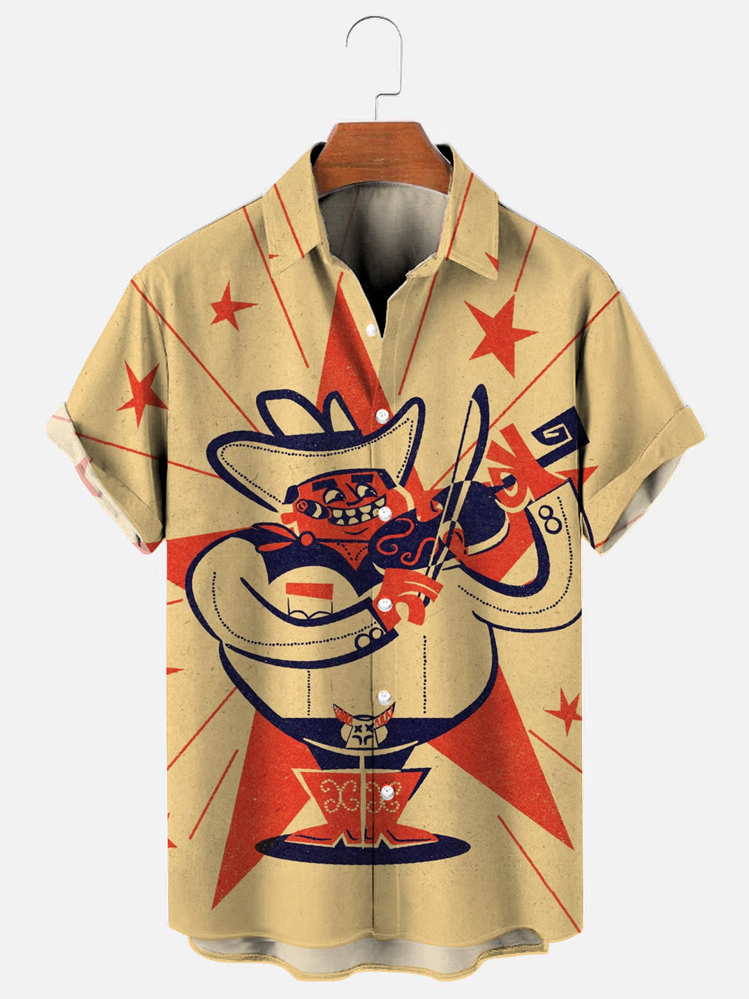 Men's Retro Western Swing Denim Music Print Hawaiian Short Sleeve Shirt