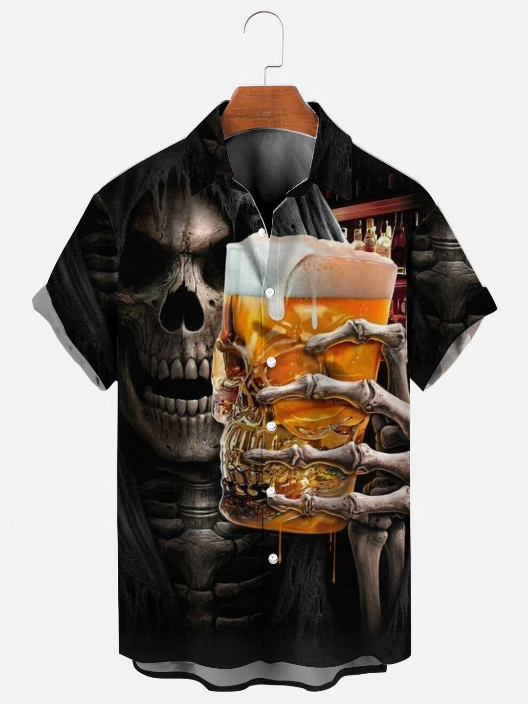 Men's Skull Beer Print Hawaiian Casual Short Sleeve Shirt
