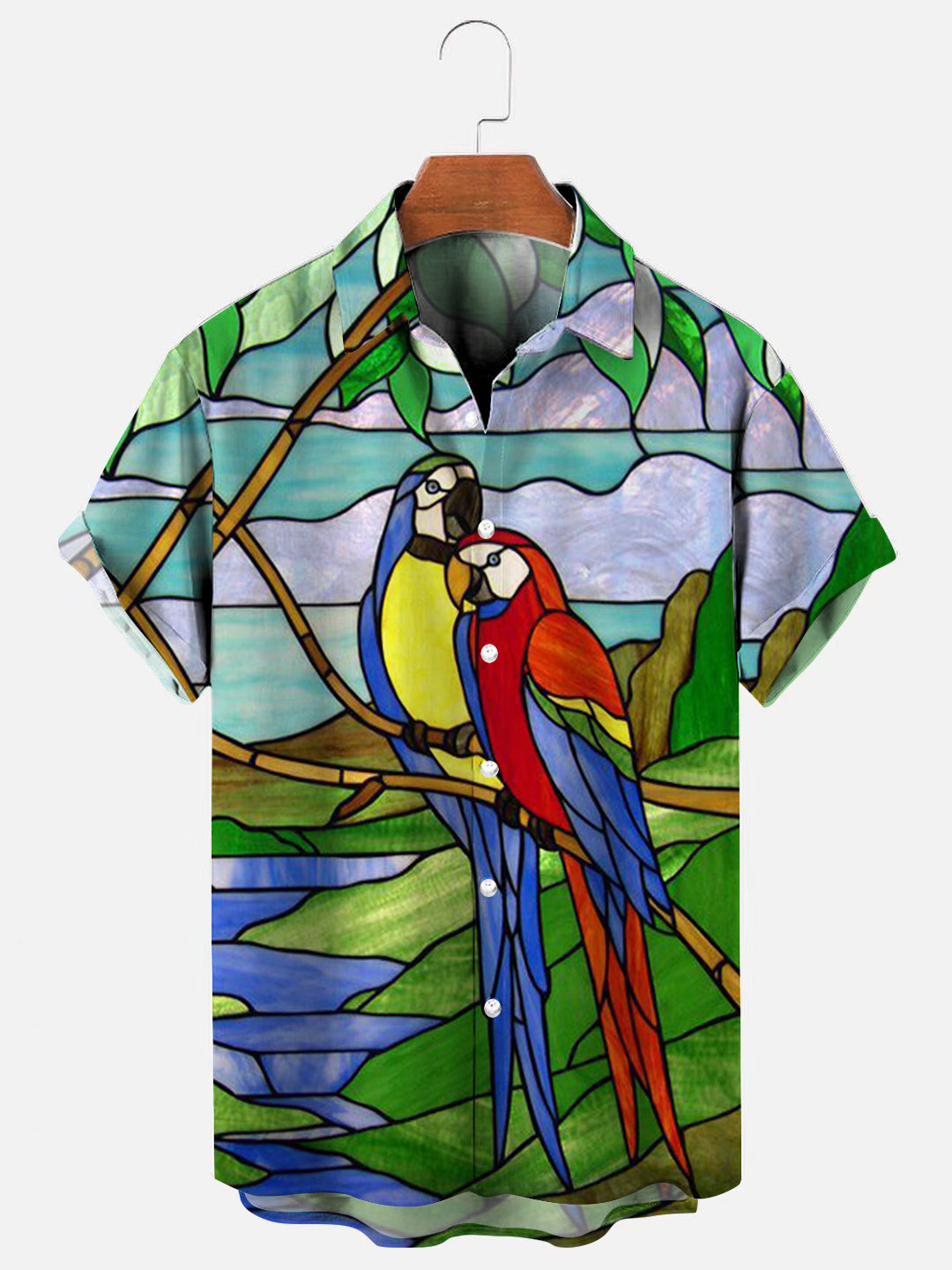 Men's Stained Glass Parrot Print Vintage Hawaiian Short Sleeve Shirt