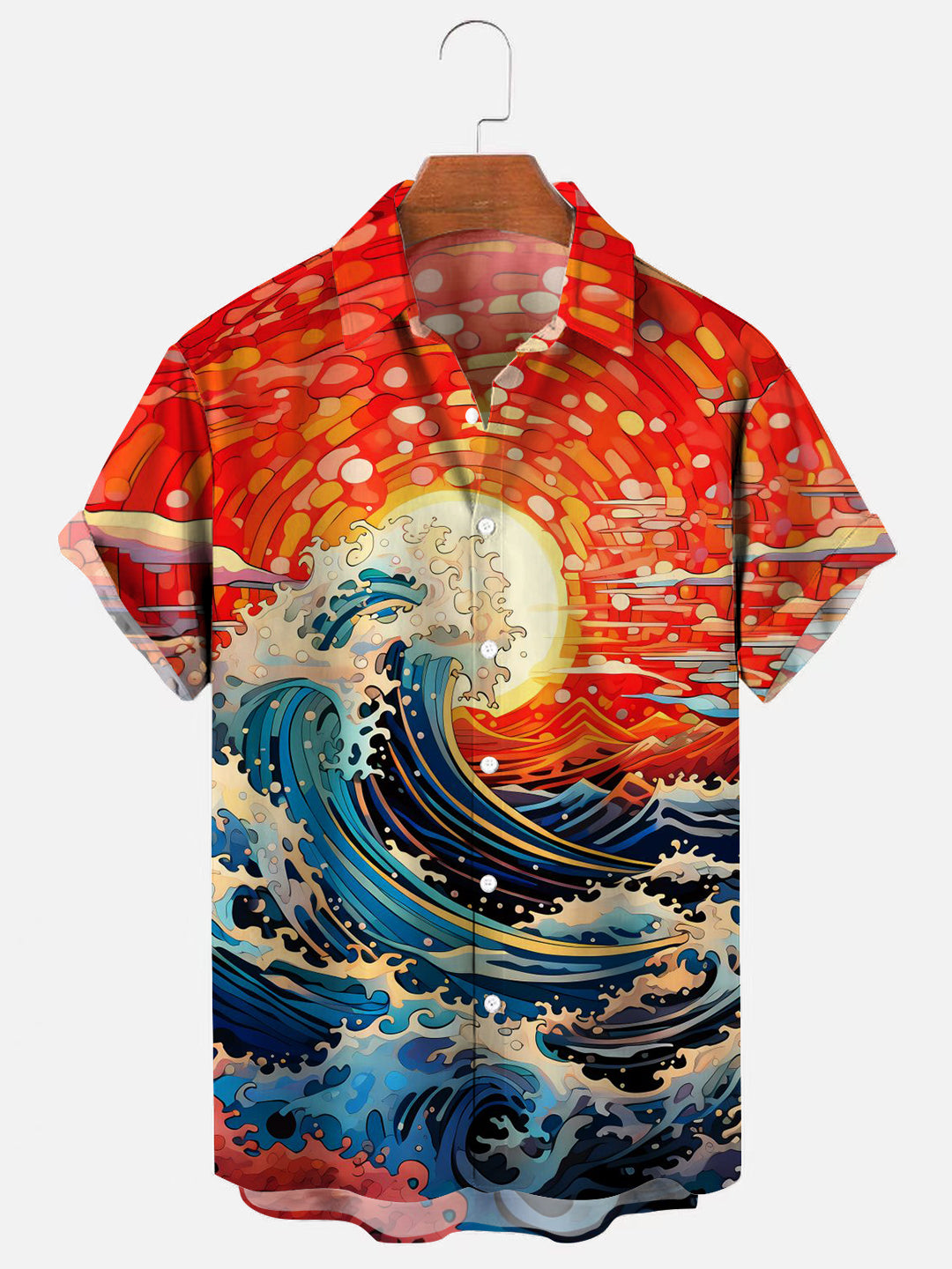 Men's Ukiyo-e Wave Print Casual Breathable Short Sleeve Hawaiian Shirt