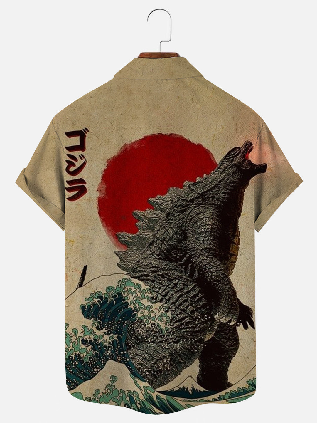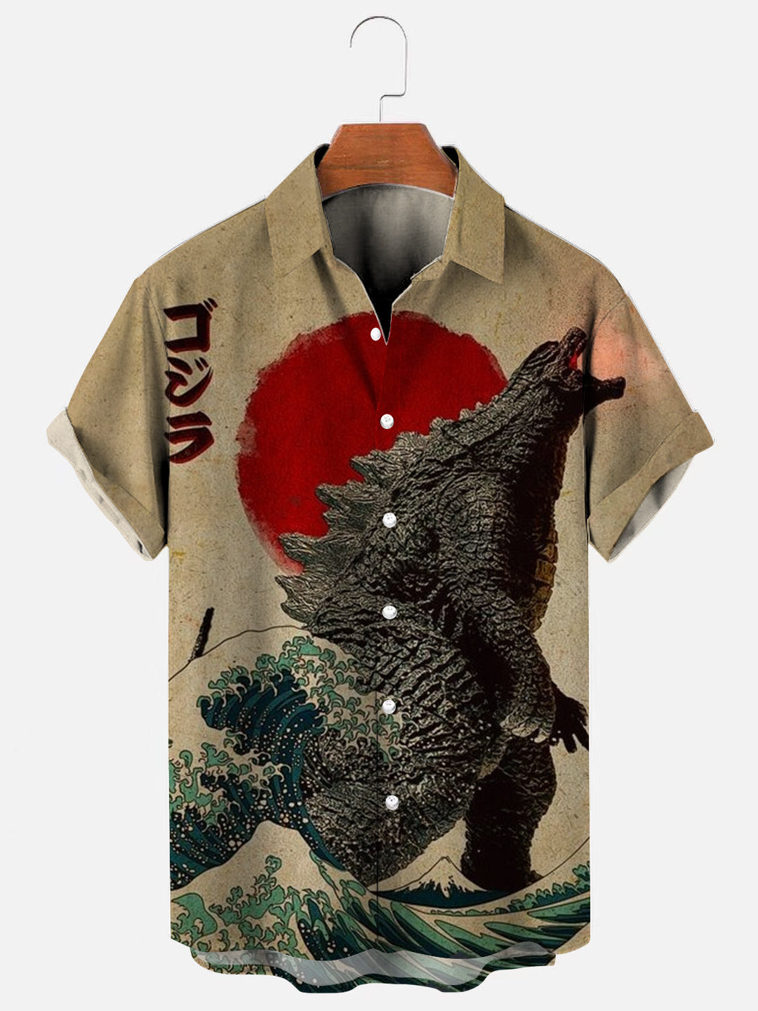 Men's Vintage Japanese Godzilla Great Wave Poster Print Hawaiian Short Sleeve Shirt