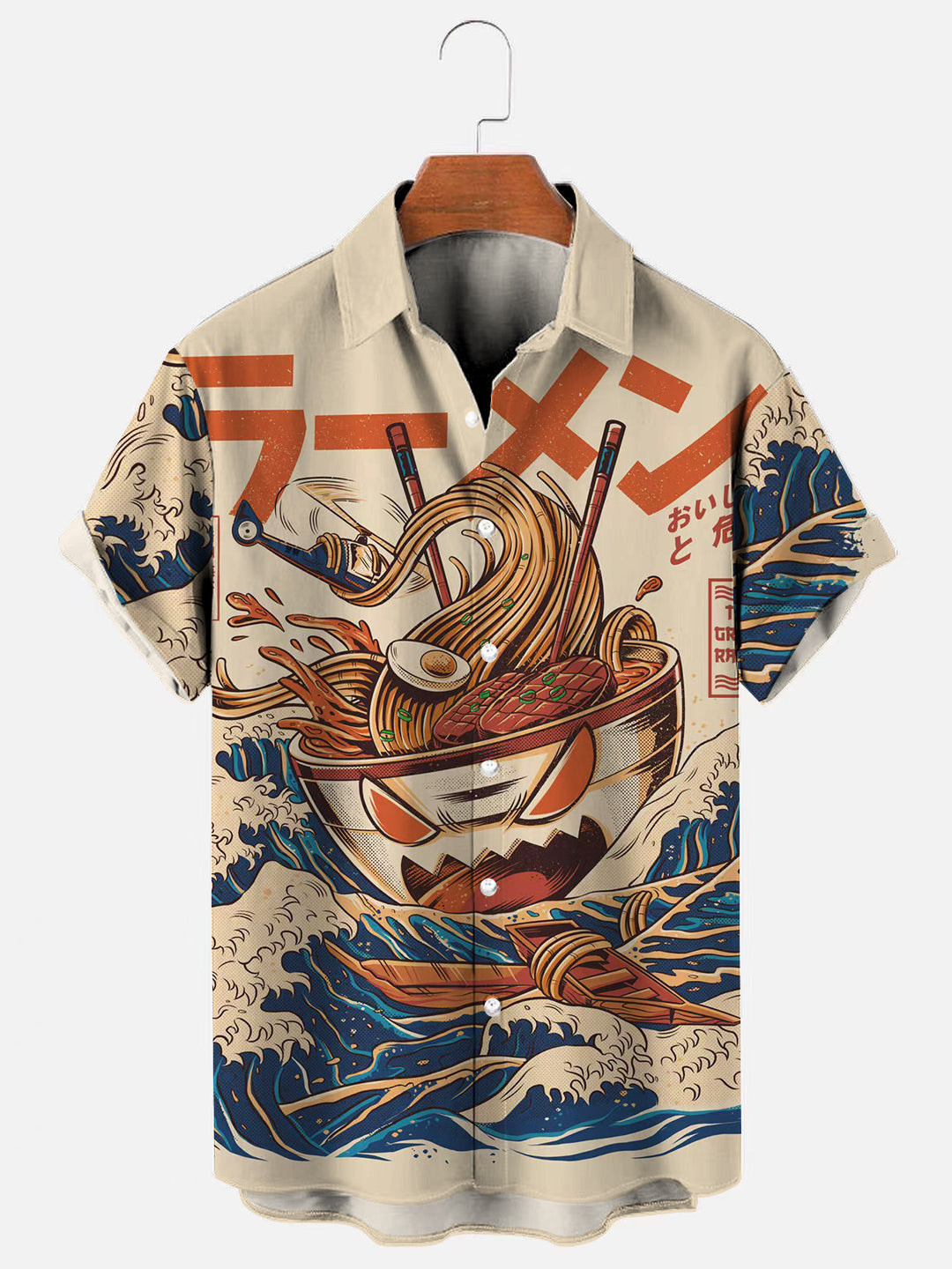 Men's Vintage Japanese Ramen Ukiyoe Print Hawaiian Short Sleeve Shirt