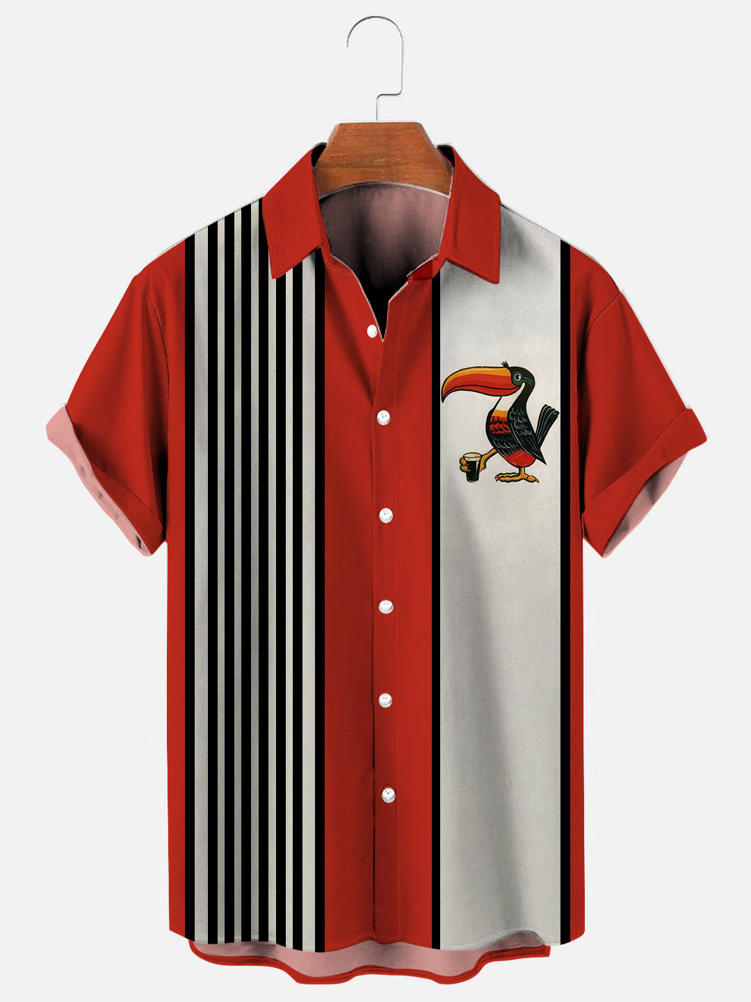 Men's Vintage Toucan Beer Stripe Print Bowling Shirt