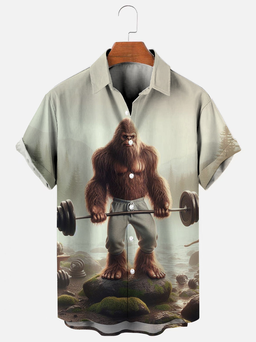 Men's Weightlifting Bigfoot Print Hawaiian Short Sleeve Shirt