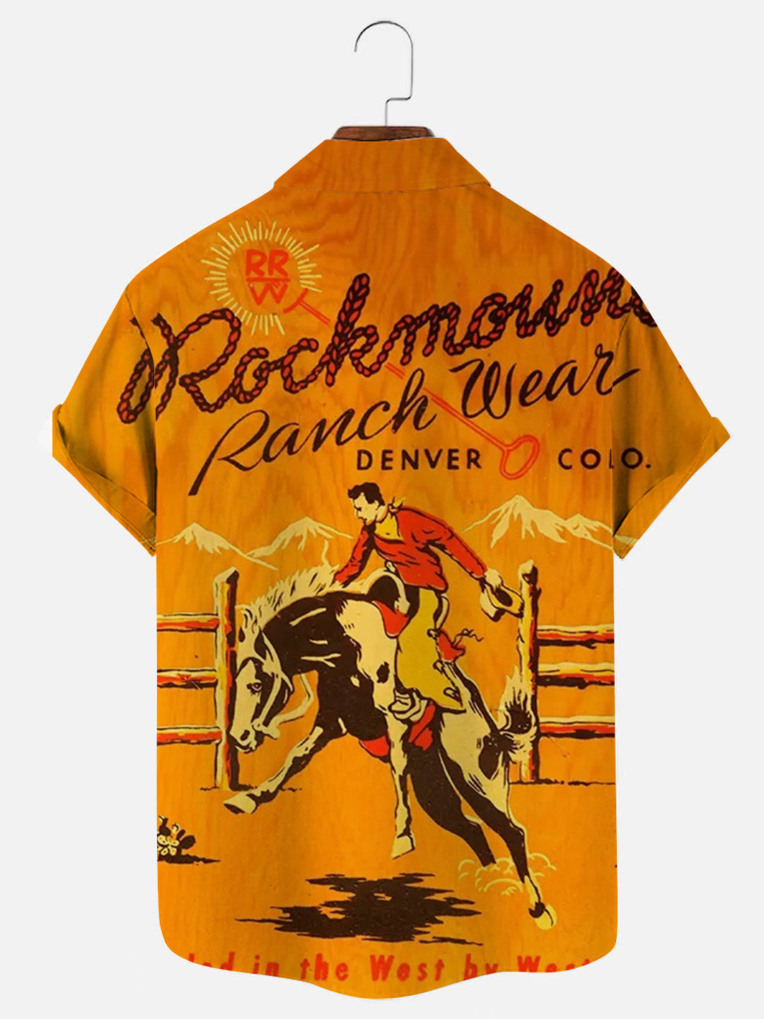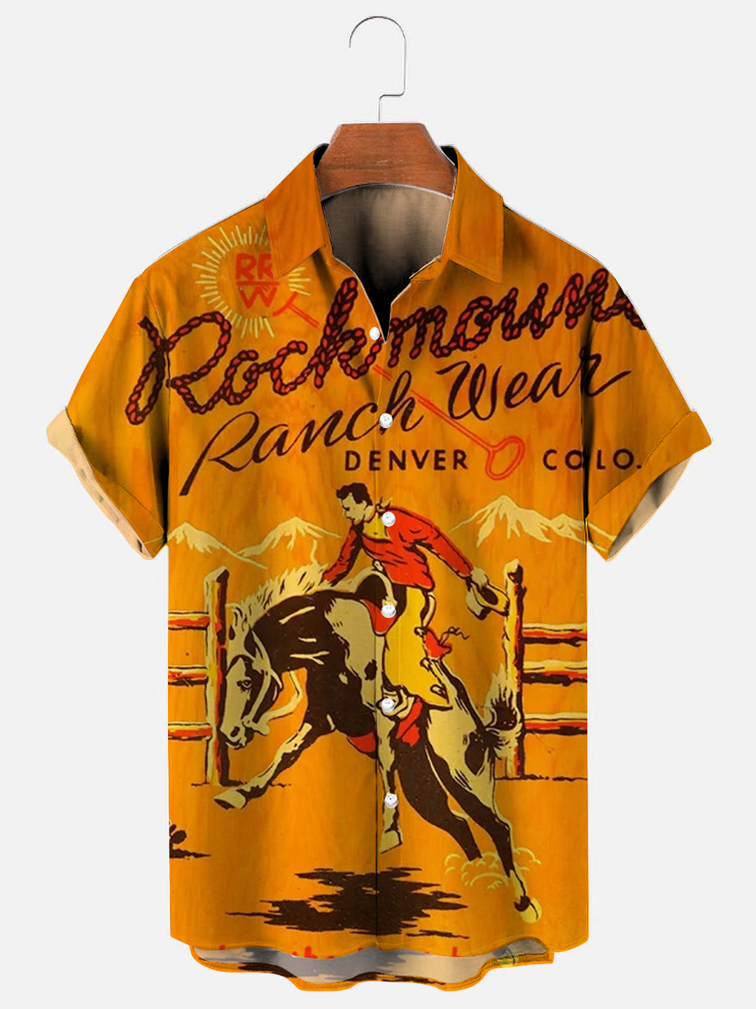 Men's Western Denim Vintage Print Hawaiian Short Sleeve Shirt