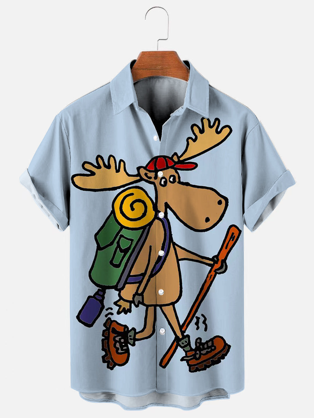 Moose Hiking Cartoon Print Hawaiian Short Sleeve Shirt