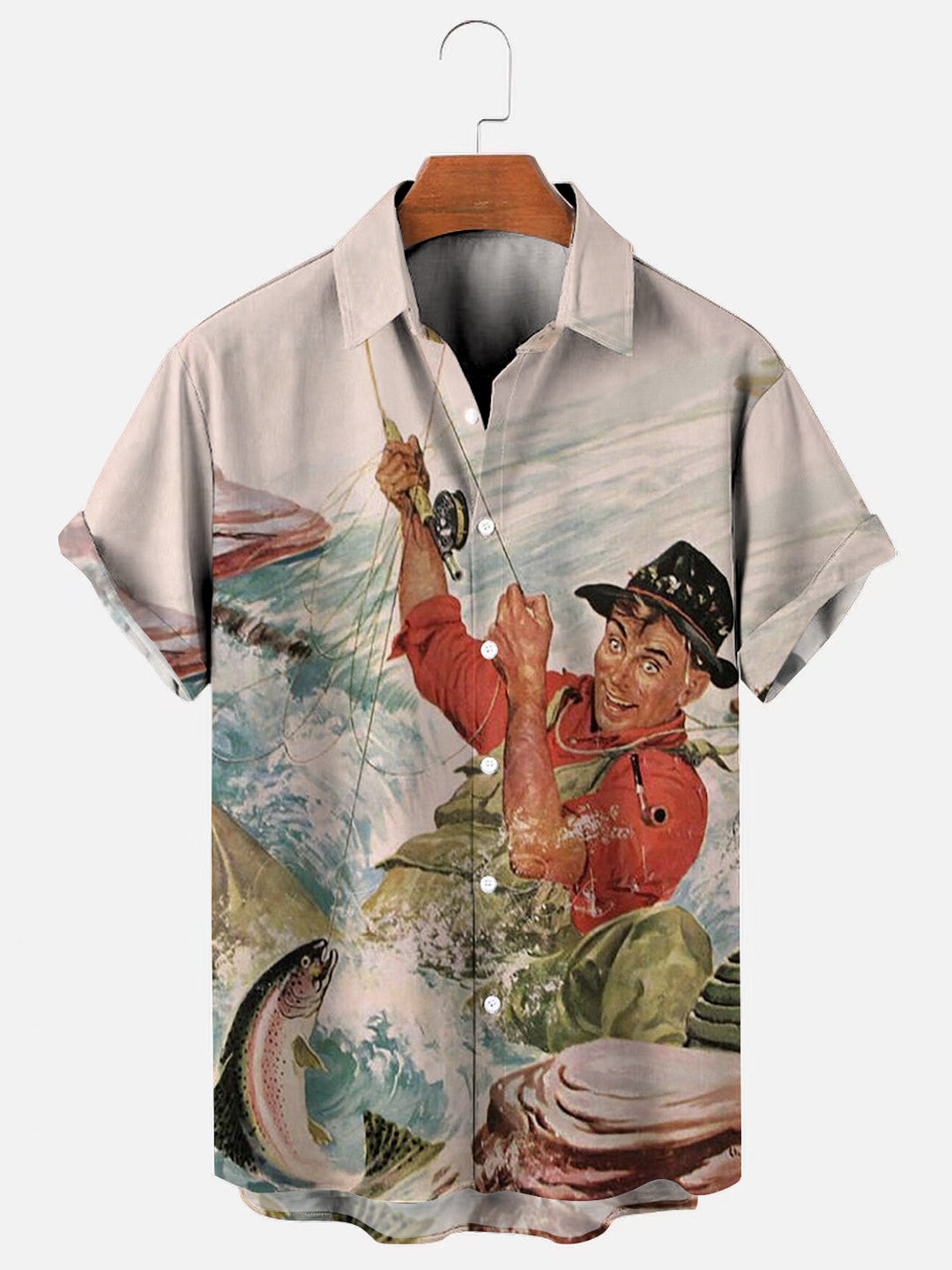 Outdoor Fishing Vintage Print Hawaiian Short Sleeve Shirt