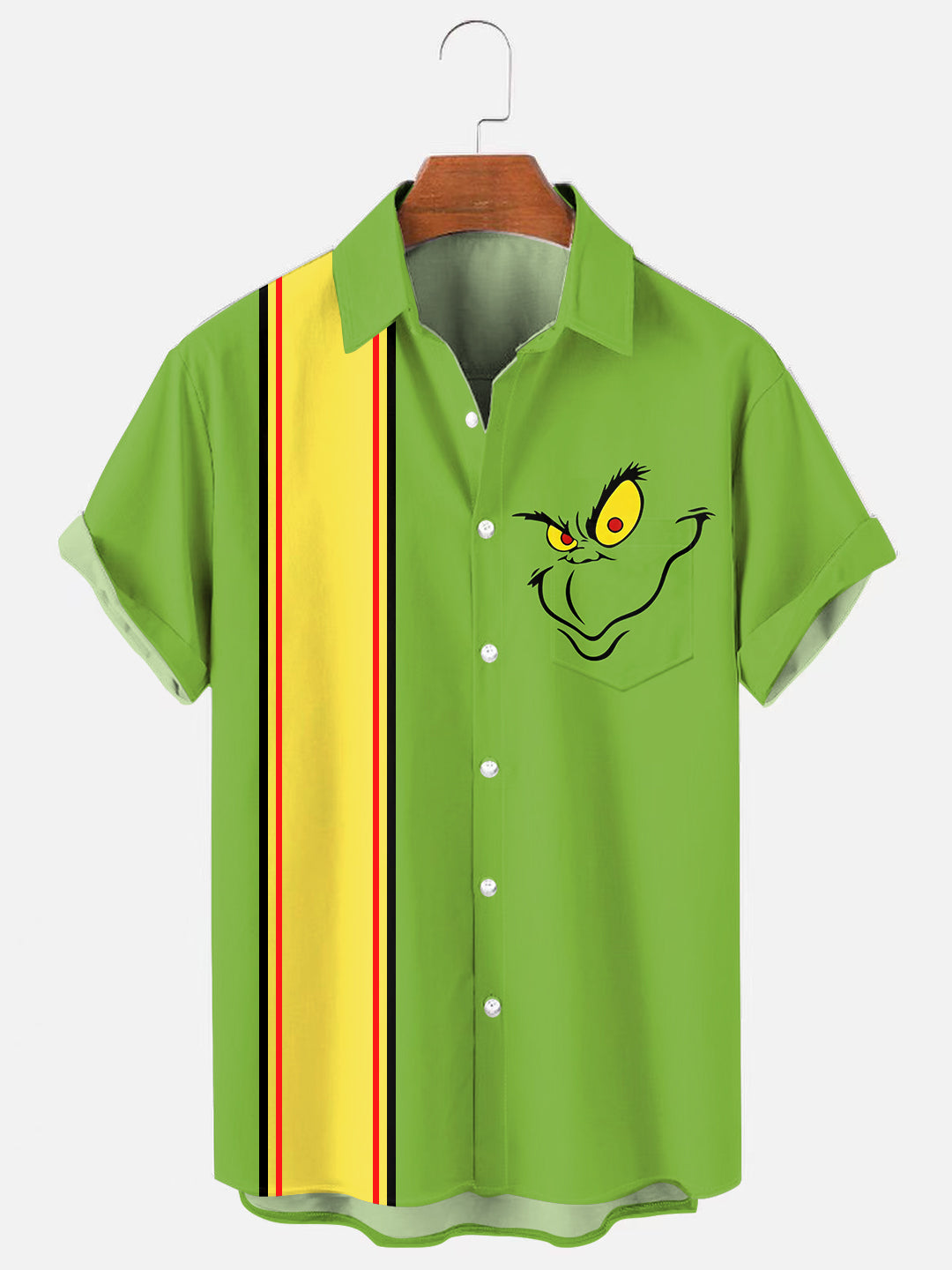 Men's Vintage Christmas Grinch Face Print Chest Pocket Bowling Short Sleeve Shirt