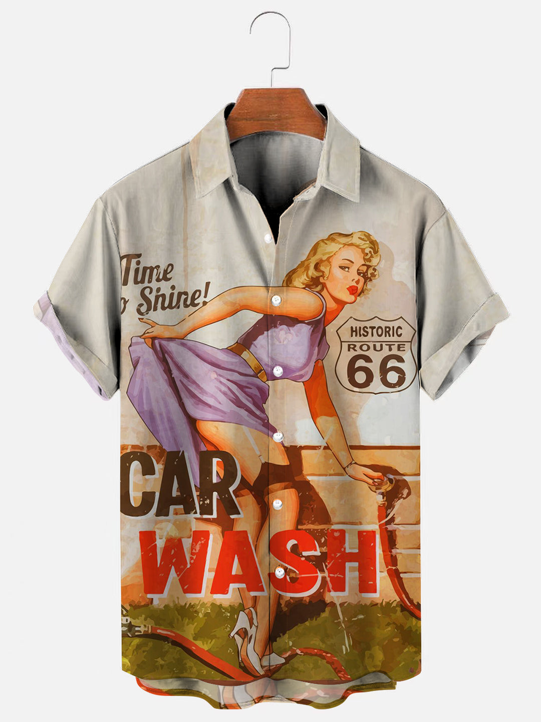 Route 66 Car Wash Girl Retro Print Casual Short Sleeve Shirt