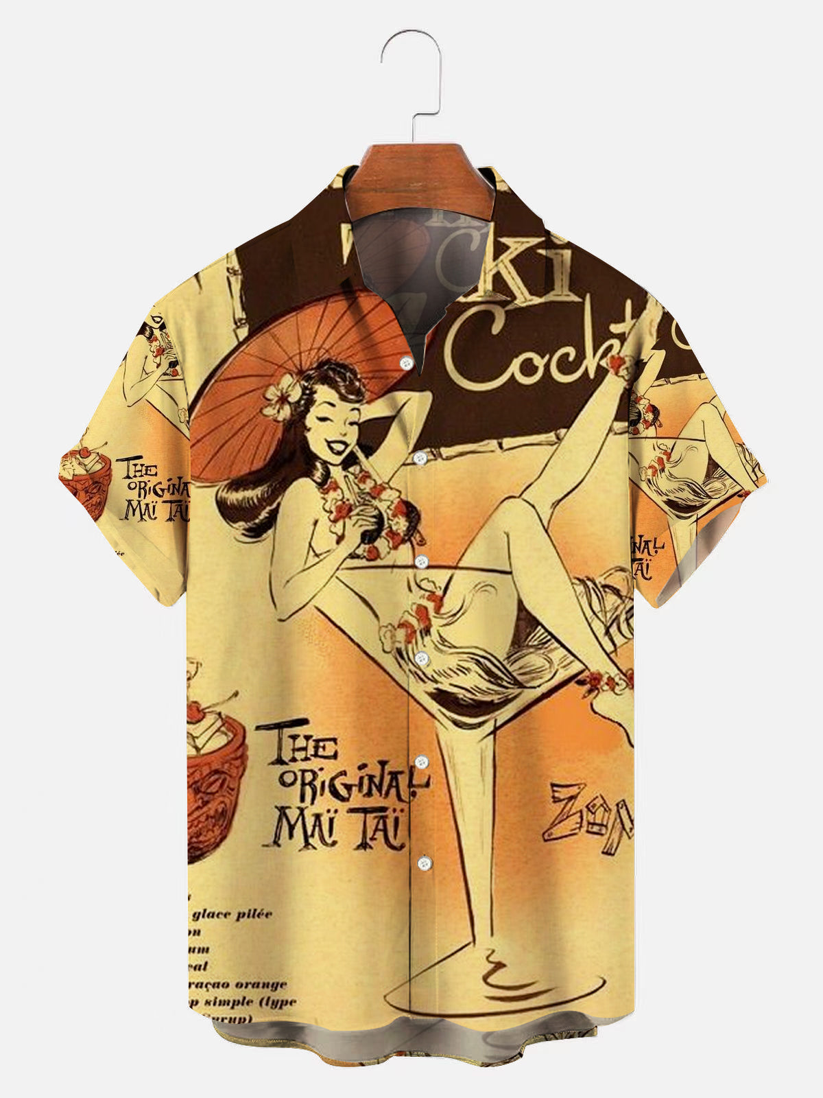 Vintage Tiki Cocktail Girl Print Short Sleeve Shirt